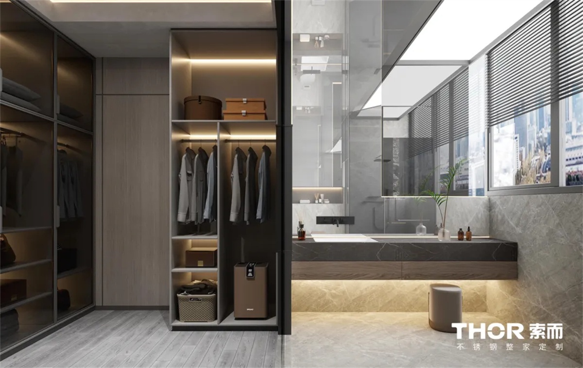 相对于传统衣柜,不锈钢定制衣柜正成为越来越多家庭的选择, 304 不锈钢的材质健康环保,即装即用,且定制款式更加灵活和人性化,让换衣梳妆时刻更舒心。